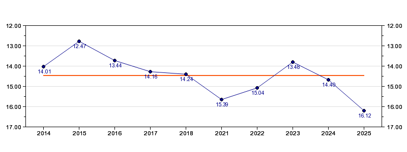 Antall deltagelser10 (i perioden 2014 - 2025)