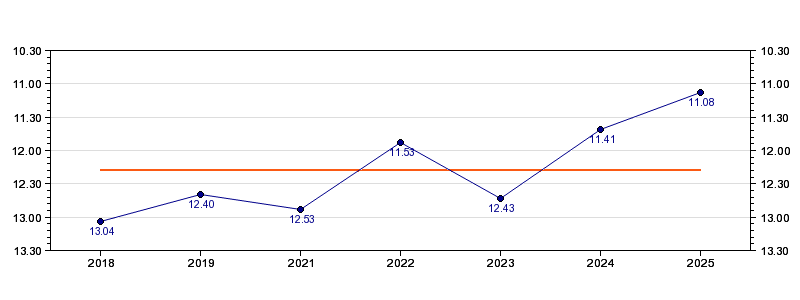 | Forrige tid | 11.08 (2025) |
