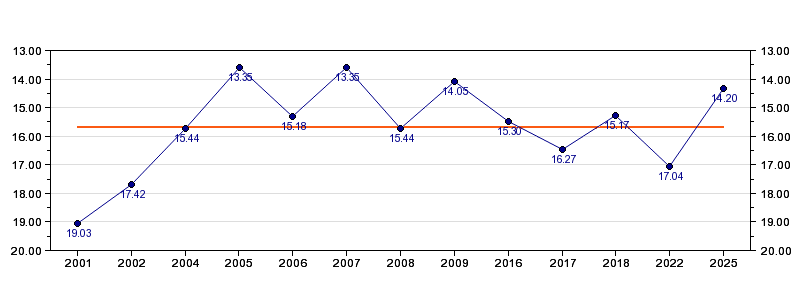 Antall deltagelser13 (i perioden 2001 - 2025)