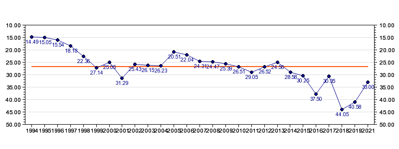 Antall deltagelser27 (i perioden 1994 - 2021)