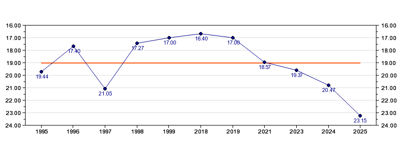 Antall deltagelser11 (i perioden 1995 - 2025)