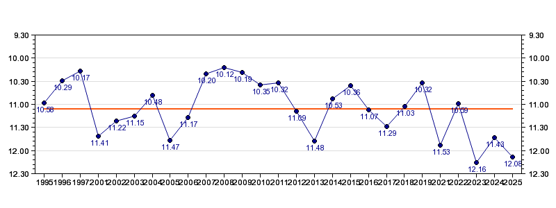 | 2025 | Kalkulator | 12:08 (1490 m/h) | 02:00 (1614 m/h, 108 %) | 05:37 (03:37, 1521 m/h, 102 %) | 10:33 (04:56, 1390 m/h, 93 %) | 12:08 (01:35, 1576 m/h, 105 %) |