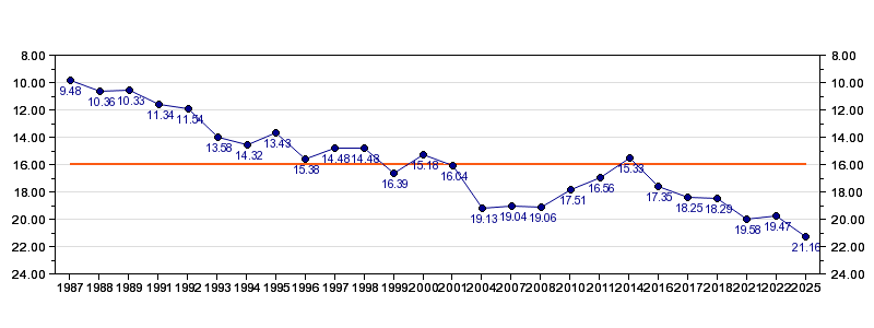 Antall deltagelser26 (i perioden 1987 - 2025)