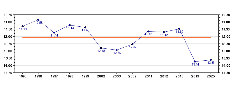 Antall deltagelser13 (i perioden 1995 - 2025)