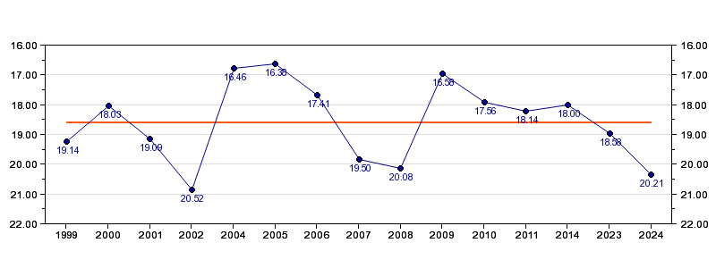 Antall deltagelser15 (i perioden 1999 - 2024)