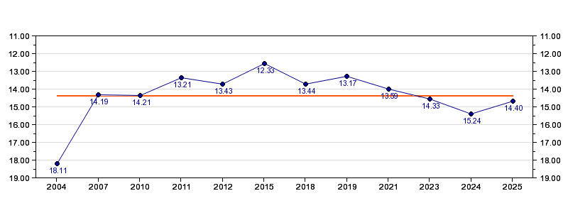 | Forrige tid | 14.40 (2025) |
