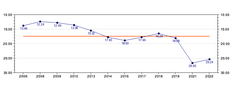 | Forrige tid | 25.24 (2022) |
