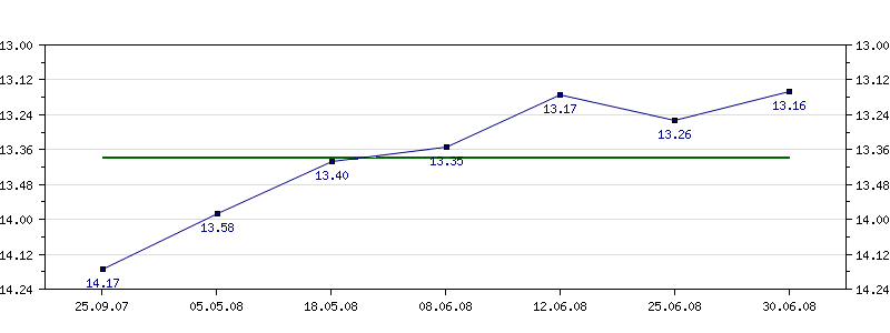 | 25.09.2007 | 14.17 | 05.05.2008 | 13.58 | 18.05.2008 | 13.40 | 08.06.2008 | 13.35 | 12.06.2008 | 13.17 | 25.06.2008 | 13.26 |