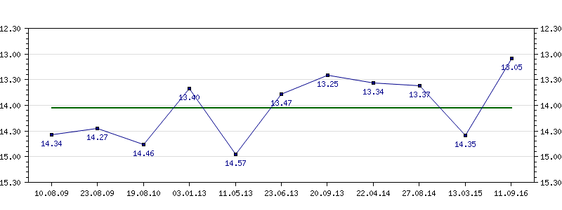 | 20.09.2013 | 13.25 | 22.04.2014 | 13.34 | 27.08.2014 | 13.37 | 13.03.2015 | 14.35 | 11.09.2016 | 13.05 |