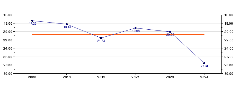 | Forrige tid | 27.34 (2024) |