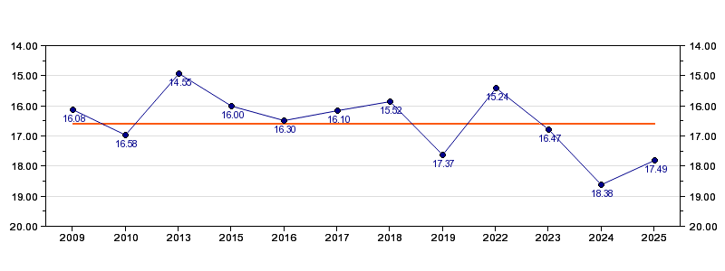 Antall deltagelser12 (i perioden 2009 - 2025)