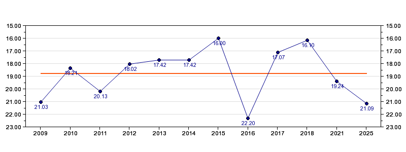 Antall deltagelser12 (i perioden 2009 - 2025)