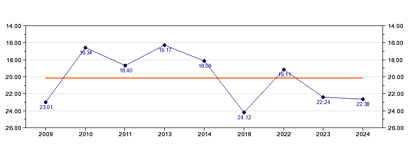 | Forrige tid | 22.38 (2024) |