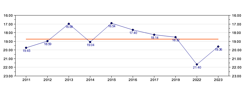 | Forrige tid | 19.36 (2023) |