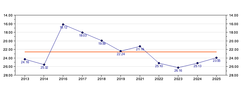 | 04.11.2019 | 24.11 | 24.11.2019 | 25.35 | 02.12.2019 | 25.40 | 09.12.2019 | 25.29 | 30.12.2019 | 27.38 | 16.01.2020 | 25.03 |