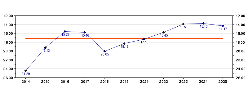 | Forrige tid | 14.17 (2025) |