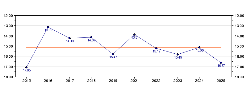 | Forrige tid | 16.37 (2025) |